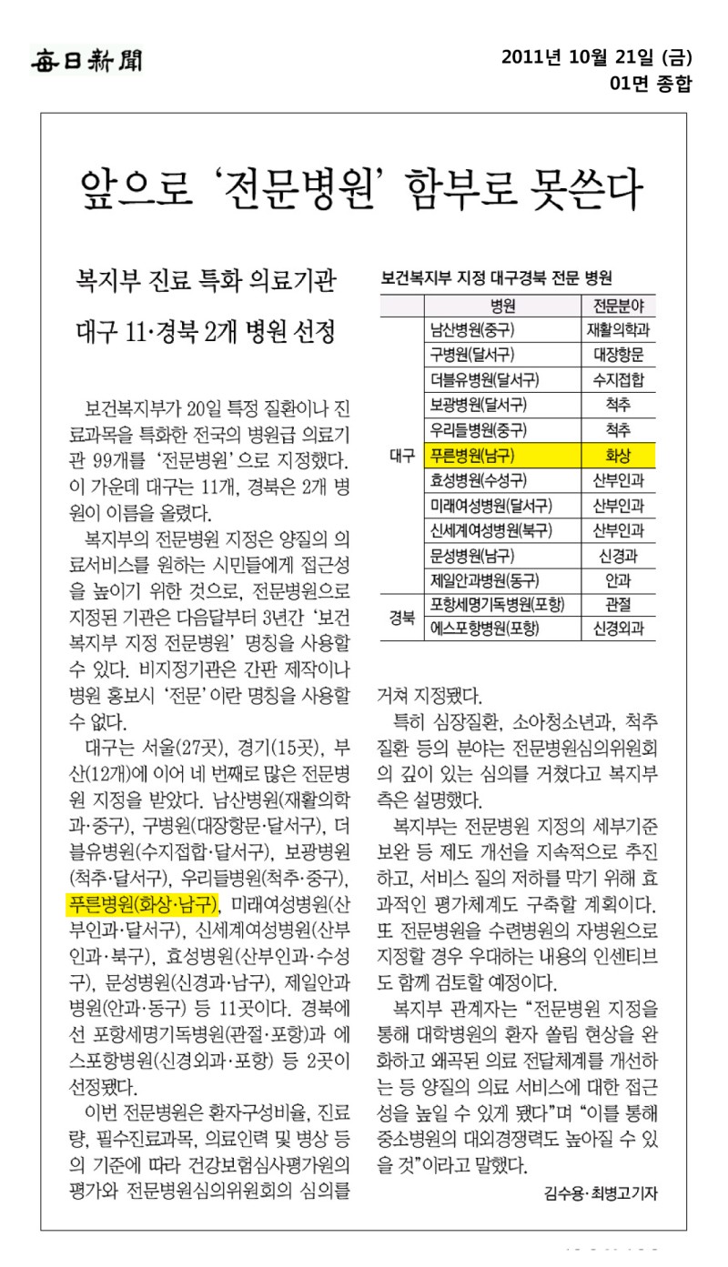언론보도 매일신문 - 앞으로 '전문병원' 함부로 못쓴다 등록일2011.10.26 작성자푸른병원 조회수7,987 매일신문 - 앞으로 '전문병원' 함부로 못쓴다 댓글 0댓글쓰기 댓글목록 등록된 댓글이 없습니다. 이전글 [이웃사랑] '온몸에 화상' 아들 돌보는 한해진 씨 다음글 화상에 치약 또는 된장? 올바른 응급처치 요령 목록