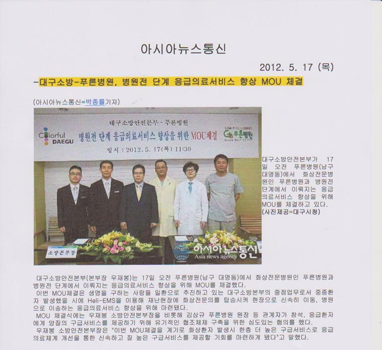 언론보도 아시아뉴스통신 - 대구소방-푸른병원, 병원전 단계 응급의료서비스 향상 MOU체결 등록일2012.05.21 작성자푸른병원 조회수8,015 아시아뉴스통신 - 대구소방-푸른병원, 병원전 단계 응급의료서비스 향상 MOU체결 댓글 0댓글쓰기 댓글목록 등록된 댓글이 없습니다. 이전글 대구소방본부-푸른병원 협약 다음글 초록우산 어린이재단과 함께하는 푸른병원 목록