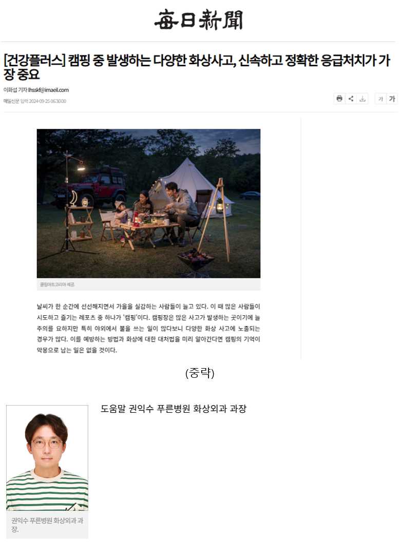 [매일신문] 캠핑 중 발생하는 다양한 화상사고, 신속하고 정확한 응급처치가 가장 중요